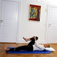 ![]() | Du skal ligge på ryggen. Træk knæet op mod maven (som vist i øvelse 1). Stræk herefter benet op mod loftet og sænk det langsomt ned til vandret med strækt knæ. |