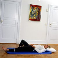![]() | Du skal ligge på ryggen med det ene ben strakt og det andet bøjet. Før det bøjede ben ud til siden og tilbage over det strakte knæ. Gentag øvelsen cirka 10 gange med hvert ben. |