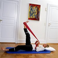![]() | Du kan med øvelsen udspænde dine muskler på bagsiden af låret. Du skal ligge på ryggen med begge ben strakt på underlaget. Læg en træningselastik eller et tov om hælen på det ene ben og løft dette ben strakt op i luften. Mærk strækket på bagsiden af det løftede ben. Hold stillingen i mindst 10 sekunder. Brug din vejrtrækning, så du strækker musklen få millimeter længere ud, hver gang du puster ud. Slap langsomt af igen. Gentag øvelsen tre gange. Lav herefter øvelsen med det andet ben. Bøj evt. det modsatte ben, hvis det gør ondt i ryggen. |