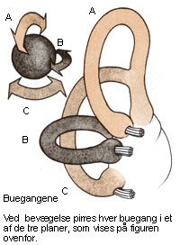 Buegangene er 3 på hinanden vinkelrette knoglerør, der indeholder væske. I rørene findes hårlignende sanseceller, der bøjes, når væsken bevæger sig. Væsken sættes i bevægelse, når hovedet bevæges, som hvis man lægger hovedet på skrå, eller når hele kroppen bevæges, hvis man f.eks. sidder i en bil, der accelerer. Forskellige buegange påvirkes, alt efter hvilken retning bevægelsen har. Bøjning af sansecellerne omdannes til et nervesignal. Det er kun ved ændring i bevægelse, at der dannes nervesignal.