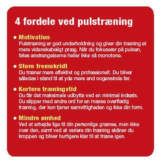 Din puls er et genialt træningsredskab, uanset om du ønsker at komme i gang med at træne, vil tabe dig eller har sat dig et mål om at komme i dit livs form. Ved at holde øje med pulsen får du nemlig et nøjagtigt billede af, hvor effektivt du træner. Netop træningseffektiviteten er ellers svær at vurdere, og mange kommer derfor uvilkårligt til at træne for hårdt. Hvis man træner i anfald af træningsraseri, vil overbelastede sener, ømme muskler og udmattelse hurtigt ødelægge glæden ved at træne og lysten til at fortsætte.